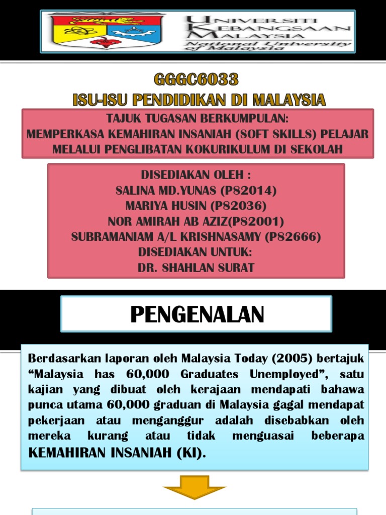 Pembangunan pelajar tidak hanya dilihat kepada pencapaian akademik yang cemerlang tetapi mempunyai kemahiran dan kualiti yang diperlukan oleh industri dan pasaran pekerjaan. Siangnya kujemput anakku dari sekolahnya, tetapi dua jam kemudian anakku kembali kesekolah untuk mengikuti les tambahan pelajaran yang memang setiap sore diikutinya. Lengkapkan diri dengan kemahiran insaniah. Jika kemahiran ini dimiliki oleh pelajar di samping kim, beliau dianggap kompeten kemahiran insaniah serta elemen elemen yang terkandung didalamnya merujuk kepada kurikulum. Matapelajaran kemahiran insaniah modul 1 :