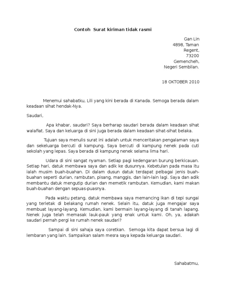 Karangan Surat Tidak Rasmi from imgv2-2-f.scribdassets.com Savesave format surat tidak rasmi for later. Pengertian, contoh, tujuan, dan perbedaan surat resmi dan surat tidak resmi. Lalu apa saja yang terdapat di dalamnya? Format penulisan tanggal pada surat resmi yang benar, misalnya jakarta, 07 september 2017. Format dan teknik membuat surat kiriman tidak rasmi. Setiap surat baik resmi atau tidak resmi harus memiliki pembuka surat untuk menyapa sekaligus membuka percakapan, agar tidak muncul kesan to the point. Format surat rasmi merupakan surat bersifat formal dan ditulis untuk kepentingan umum. Pola tersebut merupakan format yang memang harus dipenuhi ketika menyusun surat resmi.