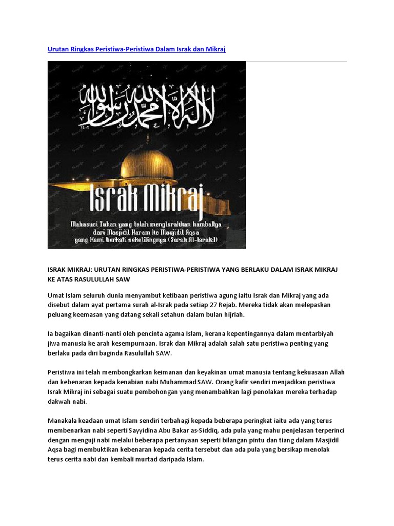 Related : Peristiwa Israk Dan Mikraj Secara Ringkas - Peristiwa Israk Dan Mikraj Secara Ringkas Denaihati - Peristiwa israk dan mikraj secara ringkas.israk mikraj adalah satu perjalanan kilat nabi muhammad pada malam hari atas kudrat dan iradat allah dari masjidil haram ke masjidil aqsa..